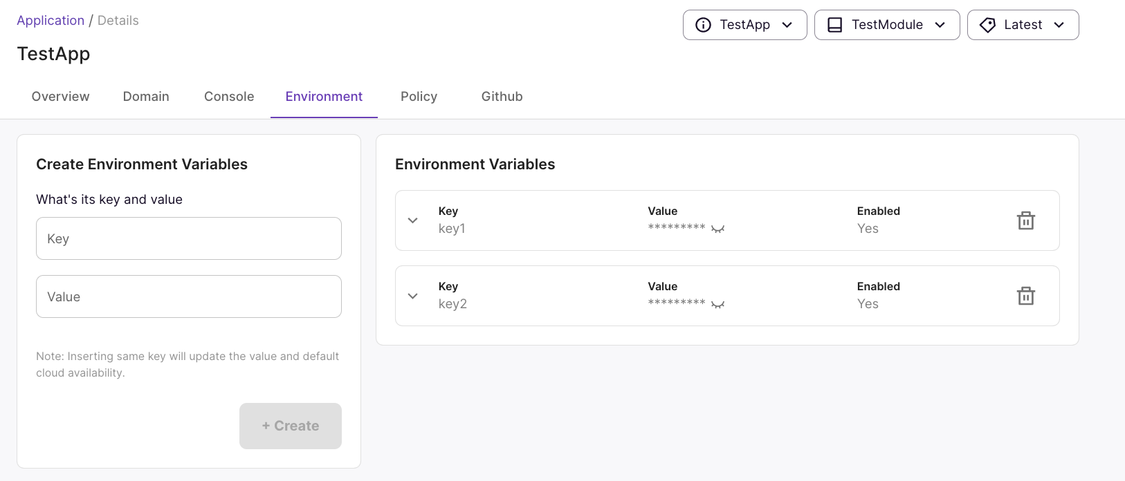 Simply by inserting the key-value pair you wish to create. Environment variables that have been created using this method will be displayed. Toggle the eye icon to see the value. The key and value could be changed by opening the dropdown on the desired key and updating its fields.