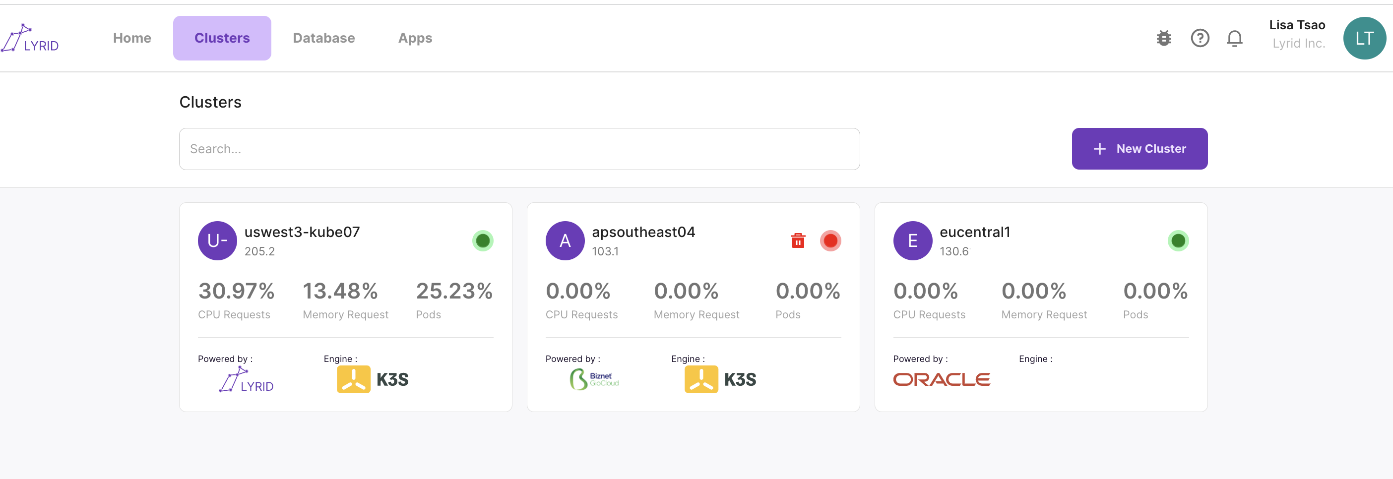 Users can see all the clusters they have deployed or purchased via Lyrid on the home dashboard or in the cluster page.