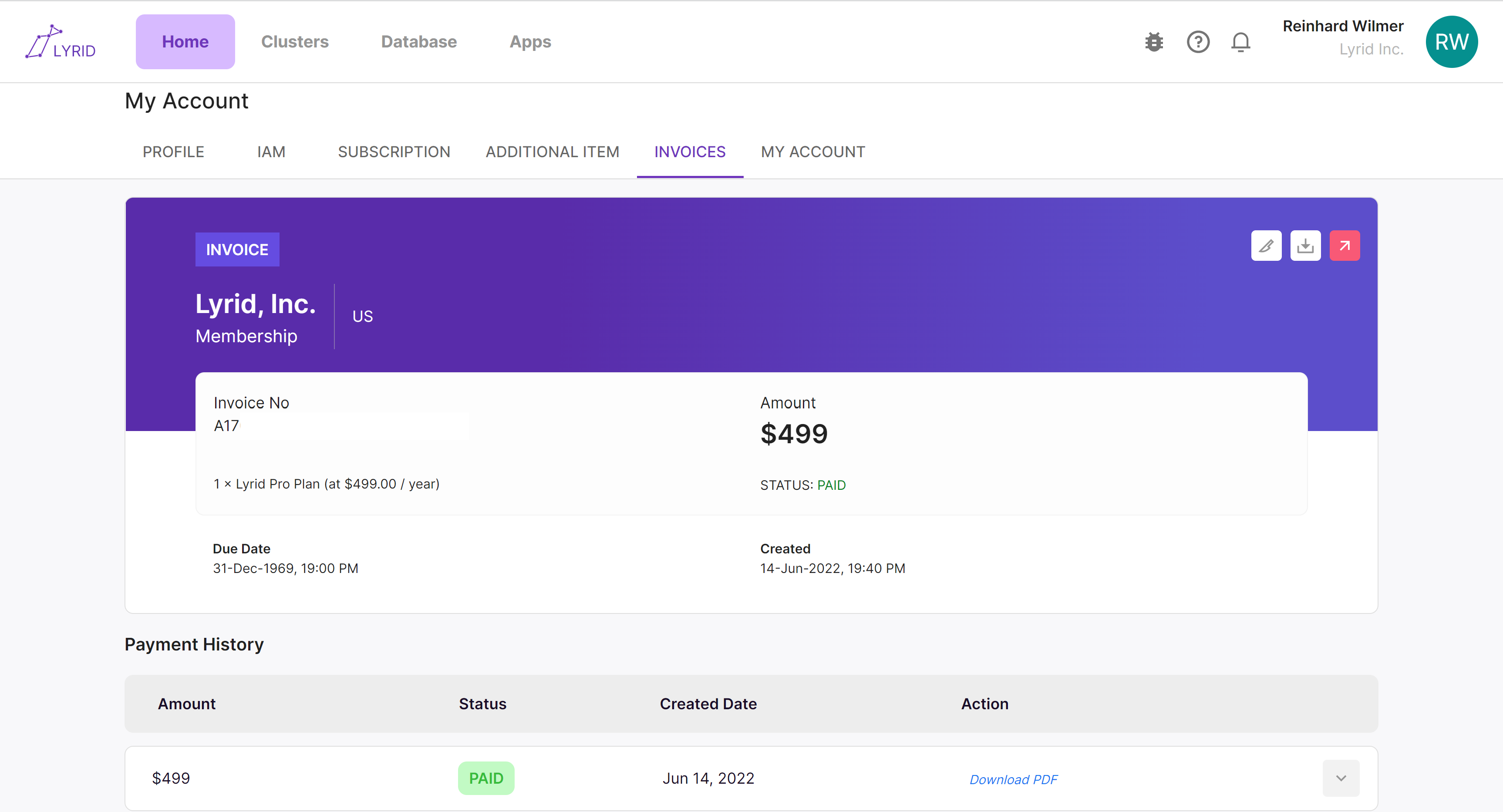 Lyrid Web Application / My Account / Invoices