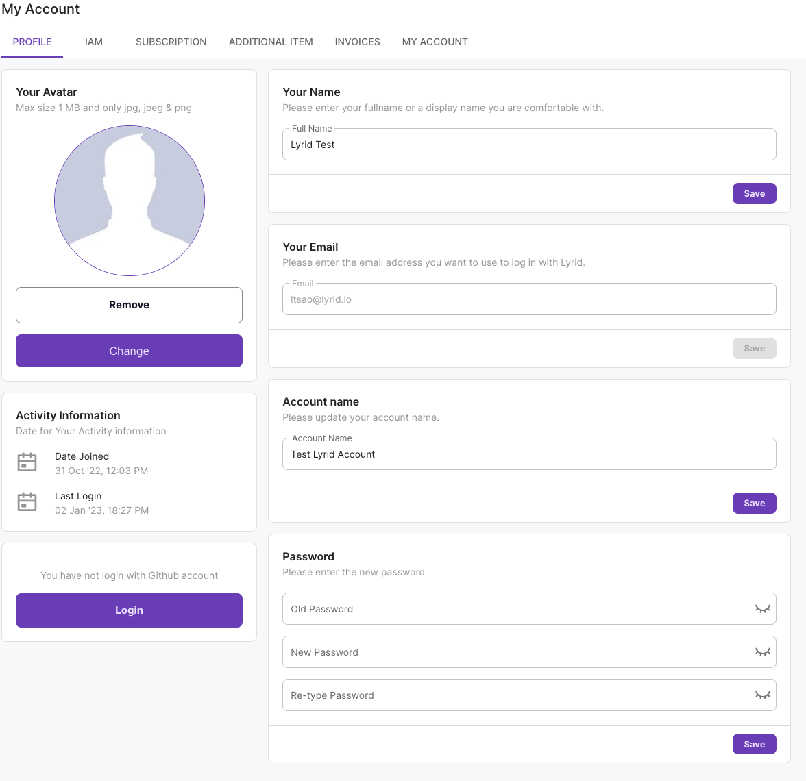 Access My Account by clicking on your avatar on the platform. Users can change their name, avatar, account name and password using the profile page. Simply input what field you would like changed and press the corresponding Save button.