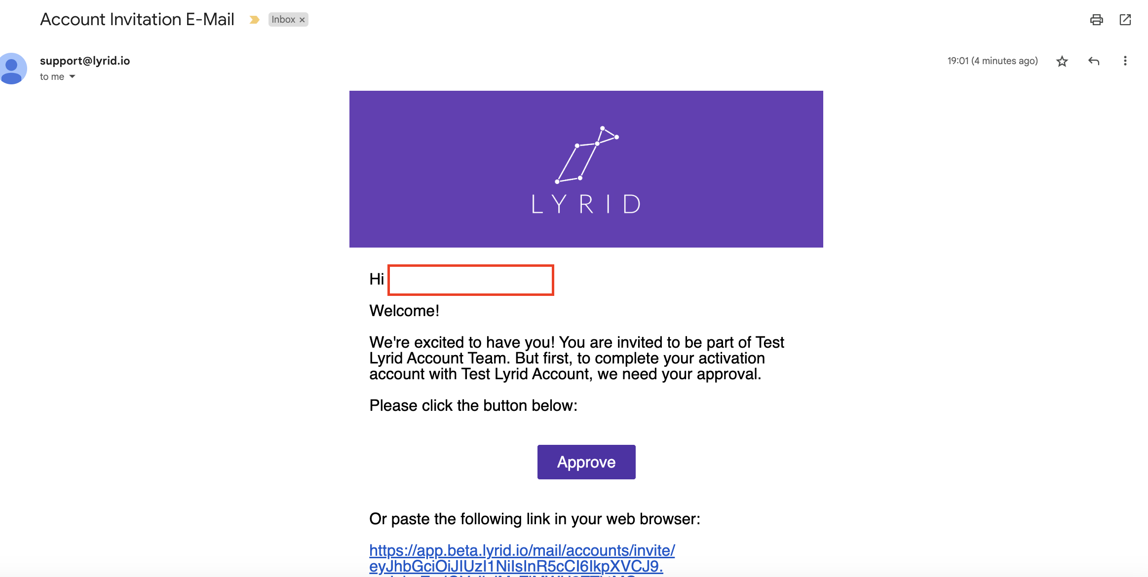 An invitation email looks just like the confirmation email, and once the receiver clicks "Approve", they will be redirected to the Lyrid Platform dashboard. If the invitee is new to the Lyrid Platform, they will be redirected to finish their account registration.
